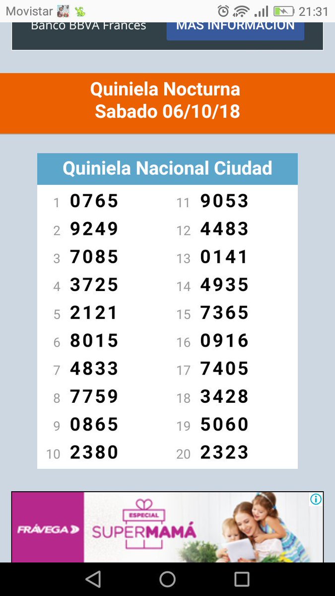 Resultados de hoy del sorteo nocturna. Revise los resultados de la quiniela nocturna hoy. Organizado por la lotería nacional de argentina, la quiniela no tiene pozo de premios, sino que se determinan en función de los aciertos, existiendo un tope de banca de 5 veces lo recaudado. En segundo término se ubicó el 0828. Resultado nocturno de la quiniela nacional de las 21.00 hs.